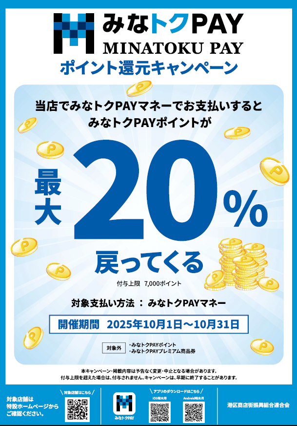 港区が運営している公共事業だけあり、お得なキャンペーンがたくさんあるのですが、今月に限り、一部の小規模店舗で支払額の20%がキャッシュバックされる破格なキャンペーンが開催されております💡
